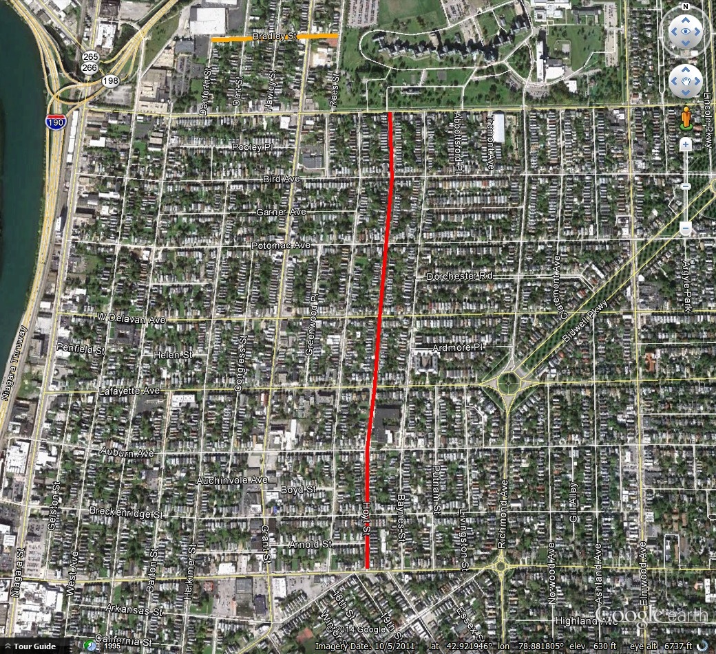 Hoyt Street is a street within the Elmwood Village neighborhood of the West Side of Buffalo. The street runs between Ferry Street and Forest Avenue, parallel to Elmwood Avenue and Grant Street. Interestingly, there was historically an earlier Hoyt Street. The original Hoyt Place was located west of the Buffalo State Hospital (now Richardson Complex) and is now known as Bradley Street. The street was renamed likely around the same time that the Hoyt Street we know today was developed, during the 1880s. Bradley Street is shown in orange on the map to the left, while Hoyt Street is shown in red.